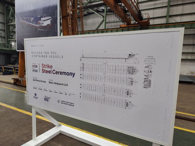 On March 2, 2026 the start of construction of two largest at Caspian Sea DCCV64 780 TEU diesel-electric shallow-draught multipurpose container vessels for AD Ports Group was marked with the solemn steel-cutting ceremony held on Baku Shipyard.